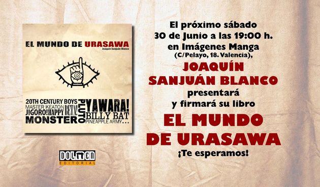 Hace unos días salió editado el libro El mundo de Urasawa, centrado en la figura del célebre creador de obras como Monster, Billy Bat o 20th Century Boys, entre otras... Este próximo día 30 a las 19:00, en la librería Imágenes-Manga de Valencia, su autor Joaquín Sanjuán Blanco presentará esta obra y firmará ejemplares a quien se lo pida.