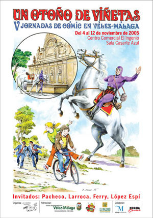 VIERNES 4 .- Inauguración oficial de las Jornadas y Exposiciones a cargo del Excmo. Sr. Alcalde Don Antonio Souvirón. Hora: 11:00 h. Lugar: Centro Comercial El Ingenio MIERCOLES 9 .- CAFE CON AUTOR. Charla-Coloquio, “La Historieta en Málaga. Una perspectiva actual” Intervienen: Benito Lozano, Manuel Mota, Pepo Pérez, Pepe Avilés, Nacho Carmona, Angel y Pachi Idígoras. Hora: 18:30 h. Lugar: Sala Casarte Azul (Vélez Málaga) JUEVES 10 .- Presentación de las publicaciones conmemorativas de las Jornadas. Hora: 12:30 h. Lugar: Salón de Plenos del Excmo Ayuntamiento de Vélez Málaga VIERNES 11 .- Charla-Coloquio Cómo editar tebeos Marvel en España y no morir en el intento Intervienen: Jose Luis Córdoba, Alejandro Martinez Viturtia. Hora: 11:00 h. Lugar: Instituto Secundaria RRCC (Vélez Málaga) .- CAFE CON AUTOR. Charla-Coloquio, “Superhéroes Made in Spain” Intervienen: Carlos Pacheco, Salvador Larroca, Pascual Ferry, Rafael López Espi. Hora: 18:30 h. Lugar: Sala Casarte Azul (Vélez Málaga) SABADO 12 .- Sesión de firmas MÁLAGA Intervienen: Carlos Pacheco, Salvador Larroca, Pascual Ferry, Rafael López Espí Horario: 11:30 h. a 13:00 horas Lugar: Centro Comercial Málaga Plaza Málaga. .- Sesión de firmas VÉLEZ MÁLAGA Intervienen: Carlos Pacheco, Salvador Larroca , Pascual Ferry, Rafael López Espí Hora: 18:30 h. a 20:30 horas Lugar: Centro Comercial El Ingenio Vélez Málaga INVITADOS - CARLOS PACHECO, dibujante y guionista, - SALVADOR LARROCA, dibujante - PASCUAL FERRY, dibujante - RAFAEL LÓPEZ ESPI, dibujante, ilustrador, - CARLOS CRUZ, dibujante, guionista - JOSE LUÍS CÓRDOBA, Director de Panini Cómics - ALEJANDRO MARTÍNEZ VITURTIA, Editor de Panini Cómics. - PEPE AVILES, dibujante. - ANGEL y PACHI IDIGORAS, humoristas gráficos. - BENITO LOZANO, dibujante - ANTONIO GUERRERO, dibujante - PEPO PÉREZ, dibujante - NACHO CARMONA, Responsable de “dreamers.es” - MANUEL MOTA, dibujante PUBLICACIONES CONMEMORATIVAS - JUANJO, el rescate de un clásico Carlos Cruz - PUEBLO Manuel Mota TALLERES (A celebrar en el Centro Comercial El Ingenio desde el viernes 4 y hasta el viernes 11, salvo sábado y domingo) -PROYECCIONES: CINE Y CÓMIC. CINESUR EL INGENIO Cuadernillo de apoyo didáctico por Jose Luis Rojas. NOTA: La actividad de cine, será por rigurosa reserva y solo a nivel de centros escolares. EXPOSICIONES Todo el día de 10:00 h a 22:00 h. Lugar: Centro Comercial El Ingenio - Generación Vértice. Tebeos para una época ![]() | |||